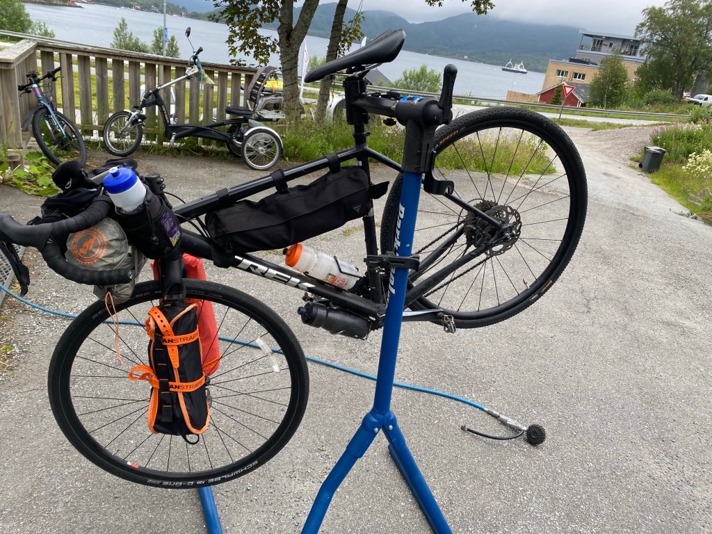 Today he was gimpy in the back tire. In fact, the back tire was shot and out of whack. I bumped 53 miles to Ørnes just praying the sports store I saw on Google maps had a bike mechanic and parts…and that I’d get there before it closed at 3 pm.